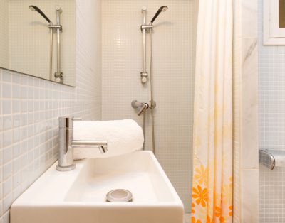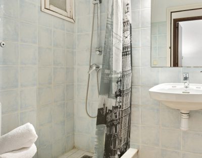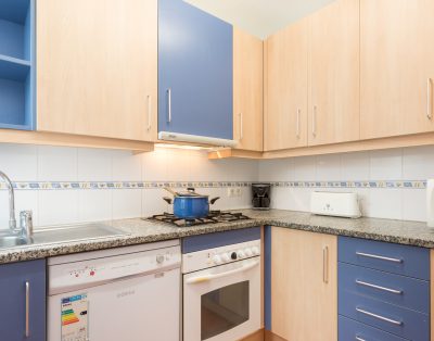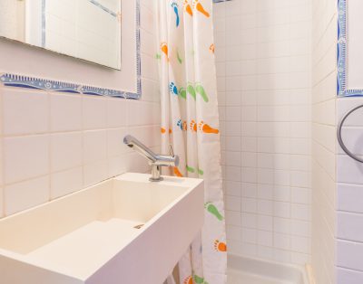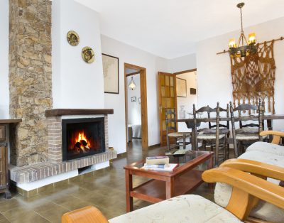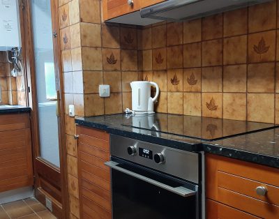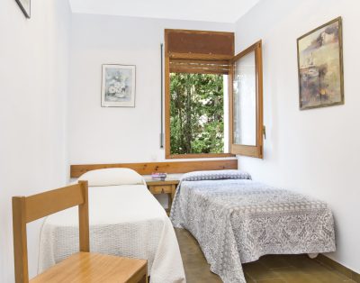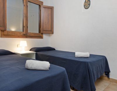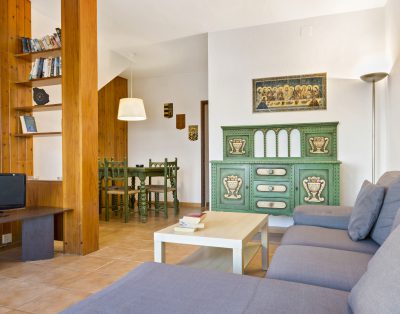 Sencillo salón comedor con tv, con 2 camas para 2 personas (90x190cm) y acceso a una terraza con vista a la montaña. Pequeña cocina equipada con todos los utensilios incluidos: cubiertos, sartenes, nevera, congelador, microondas y horno. Cada apartamento tiene 1 dormitorio con 2 camas individuales (90x190cm) y 1 baño con ducha.